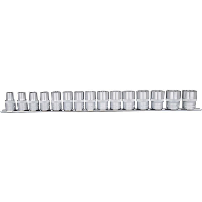 Poligonale Profilo FlankTraction Secondo DIN 3124 / ISO 2725-1 Quadro femmina a norma DIN 3120 / ISO 1174 con sede per sfera di tenuta Esecuzione corta Per utilizzo manuale Cromata opaca Cromo-vanadio Fornite con supporto Azionamento quadro in pollici 1/2 Standard DIN 3120, ISO 1174, DIN 3124, ISO 2725-1 Profilo 1 12-Kant Pezzi in set 15 Peso del tessuto 1200 Imballaggio Clipleiste aus Metall Dimensioni dell'imballaggio 1 Forma gerändelt Materiale1 Feinster Chrom Vanadium Stahl, matt satiniert verchromt