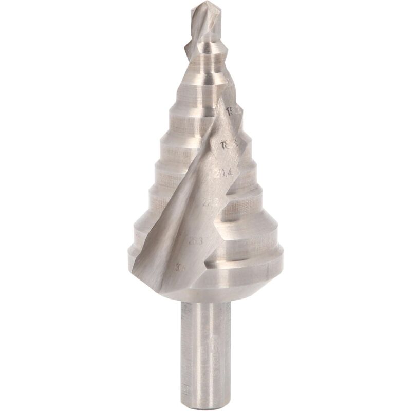 Affilatura a norma DIN 1412 C Tagliente a croce Taglio destrorso Scanalatura a spirale Angolo tagliente 118° Angolo cono 90° Vibrazioni minime Elevata capacità di taglio Finitura lucida Acciaio ad alte prestazioni in lega al cobalto Il cono facilita il ritorno in caso di lamiere forate. Avanzamento particolarmente elevato su metalli non ferrosi grazie al minimo coefficiente di attrito. Diametro del gambo D3 10 Materiale da taglio HSS Co 5 Lunghezza della fessura di tensione 23 Diametro D1 30.5 Peso del tessuto 150 Diametro D2 6 Diametro in mm 6 - 30,5 Lunghezza parziale L2 in mm 57 Dimensioni dell'imballaggio 1 Materiale1 kobaltlegierter Hochleistungsstahl Lunghezza totale L1 in mm 80 Numero di gradini 9 Standard DIN 1412 C Angolo della punta 118° Area di applicazione del materiale Bleche und NE-Metalle Direzione di taglio rechts Colore silber Superficie blank