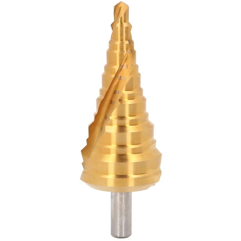 Affilatura a norma DIN 1412 C Tagliente a croce Taglio destrorso Scanalatura a spirale Angolo tagliente 118° Angolo cono 90° Vibrazioni minime Elevata capacità di taglio Superficie rivestita in TiN Acciaio ad alte prestazioni Il cono facilita il ritorno in caso di lamiere forate. Avanzamento particolarmente elevato su metalli non ferrosi grazie al minimo coefficiente di attrito. Diametro del gambo D3 12 Materiale da taglio HSS TiN Lunghezza della fessura di tensione 25 Diametro D1 40.5 Peso del tessuto 275 Diametro D2 7 Diametro in mm 7 - 40,5 Lunghezza parziale L2 in mm 70 Dimensioni dell'imballaggio 1 Materiale1 Hochleistungsstahl Lunghezza totale L1 in mm 95 Numero di gradini 13 Standard DIN 1412 C Angolo della punta 118° Area di applicazione del materiale Bleche und NE-Metalle Direzione di taglio rechts Colore gold Superficie TiN