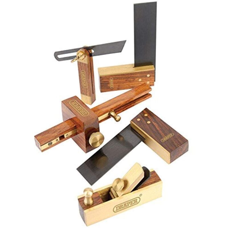 All tools are manufactured from solid brass and polished hardwood delivering a professional feel, lo The sliding bevel, dovetail square and try square feature a precision machined blackened steel blad The set is completed with a portable storage pouch Display packed Tutti gli strumenti sono realizzati in ottone massiccio e legno lucido offrendo un tocco professionale, aspetto e prestazioni. Lo smusso scorrevole, coda di rondine quadrato e provare caratteristica piazzare una lavorazione di precisione lama in acciaio annerito. Il set si completa con un sacchetto di archiviazione portatile. Schermo pieno.