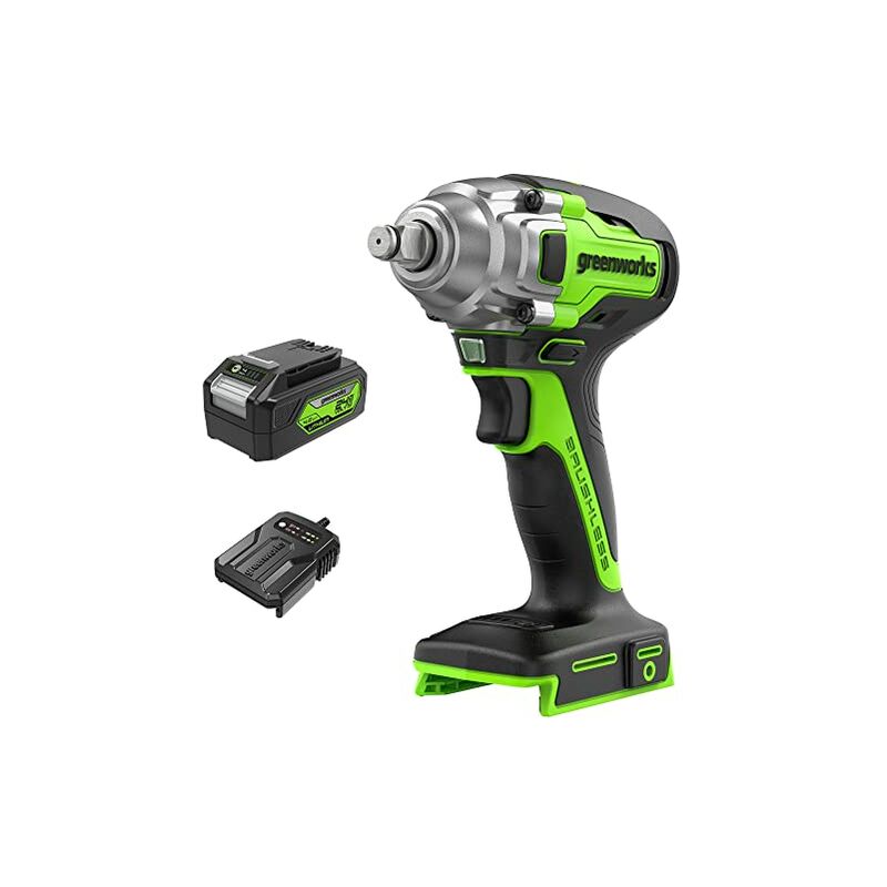 Greenworks Tools, Avvitatore a impulsi(Li-Ion 24V 400Nm coppia 2800 giri/min chiave a tubo da 1/2 con attacco quadro motore potente)&2x Bat. G24B4&Caricabatterie Universale G24X2UC2,verde grigio nero Clé à chocsSize: Clé à chocs;