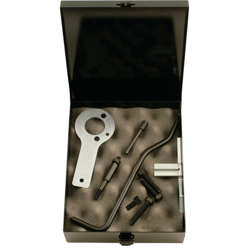 Per la riparazione professionale del motore Per il bloccaggio dell'albero a gomito e dell'albero a camme Per la sostituzione della puleggia dentata Elevata adattabilità In robusta cassetta metallica Campi di applicazione: Fiat Brava, Bravo, Marea, Marea e Peugeot con motori 1,9 D/TD (> 1996)