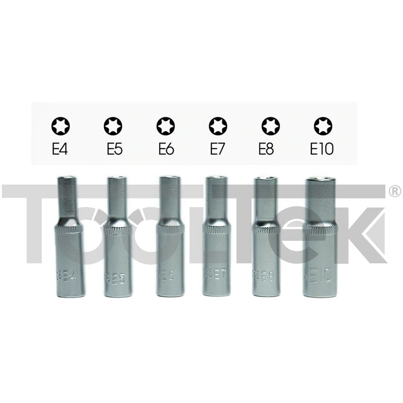 Set chiavi a bussola utile per tutti gli appassionati di modellismo e fai da te, indicato in modo particolare per la manutenzione o la riparazione di parti meccaniche, per fissare o rimuovere viti o bulloni torx. CARATTERISTICHE: Set chiavi torxMateriale: acciaio cromo vanadio Attacco: 1/4 6 misure: E4, E5, E6, E7, E8, E10 Lunghezza chiave T: 11 cm circa Prodotto di qualità.