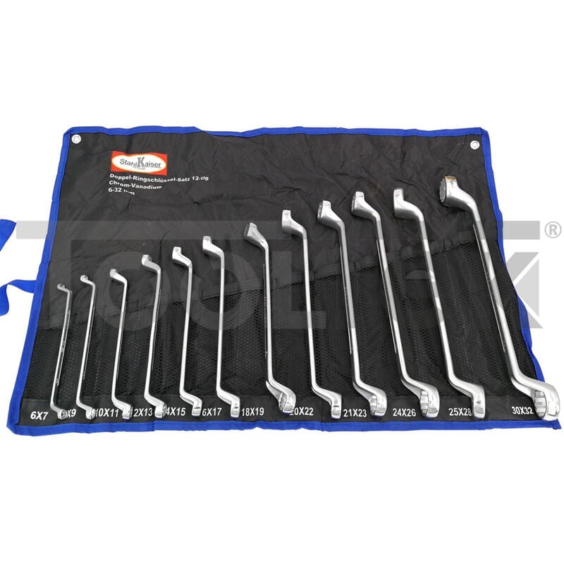 Set di chiave a doppio anello, 75 ° piegata, 6 - 32 mm, 12 pezzi . MISURE: 6 x 7, 8 x 9, 10 x 11, 12 x 13, 14 x 15,16 x 17, 18 x 19,20 x 22, 21 x 23, 24 x 26, 25 x 28, 30 x 32 mmAnello pagine doppio woofer a gomito Forgiato a freddoCon custodia arrotolabile in Tetron. Prodotto di qualità.