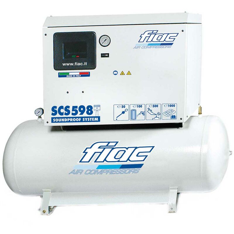 COMPRESSORE FIAC SCS 598/300 La serie di compressori insonorizzati a pistoni FIAC da 0,75 a 10 HP è il prodotto della più recente ricerca tecnologica e di design.I modelli SCS sono caratterizzati in particolare da un sistema insonorizzante costituito da pannello fonoassorbentidi metallo verniciati a polvere epossidica che garantiscono ottimi livelli di silenziosità e la totale assenza di vibrazioni (pressione sonora < 70 dB).Le principali caratteristiche tecniche sono:Pannello sinottico di controllo elettromeccanico con pulsante di start, pulsante diemergenza, contatore e manometro.Sistema di ventilazione supplementare a comando remoto mediante sonda termostaticaCassetta elettrica e motore elettrico in classe di protezione IP55Sistema di antivibranti a 4 punti di fissaggio Dati tecnici: capacità serbatoio: 270 lt pressione massima: 10 bar - 145 psi aria aspirata: 600 l/min - 35,9 m3/h velocità di rotazione: 1270 min rumorosità 69 db (A)cilindri/stadi: 2/2 aria pompante 21,1 CFM