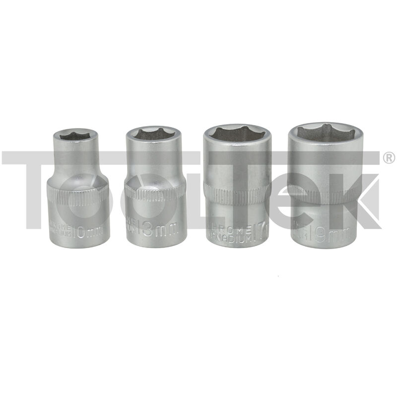 Set chaivi a bussola 4 pezzi 10-19mm. CARATTERISTICHE: Profilo: esagonale Attacco: quadro 1/2 Misure: 10, 13, 17, 19 mm. Prodotto di qualità.
