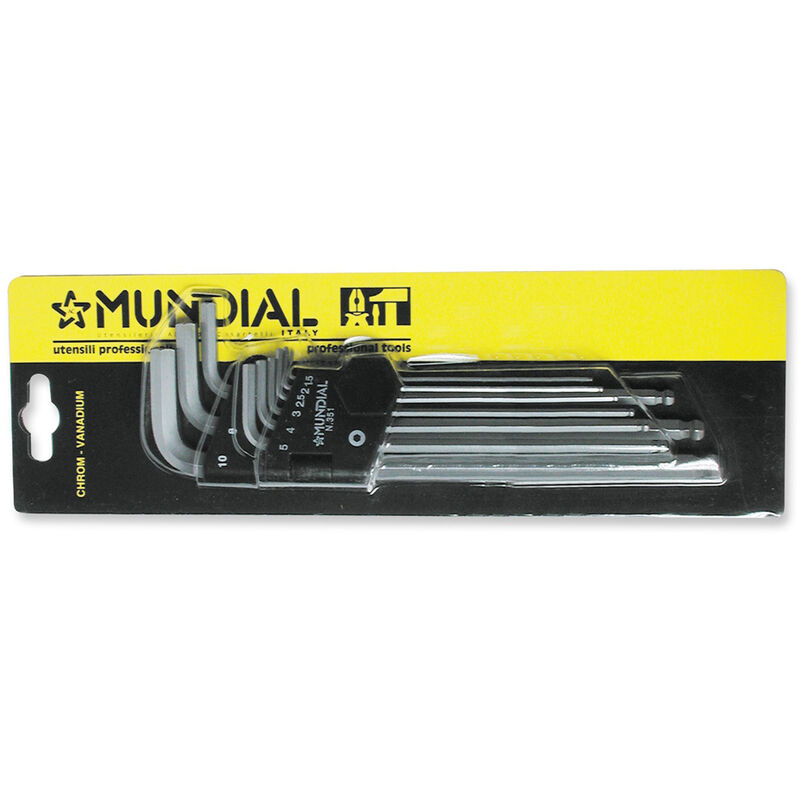 Serie 9 chiavi esagonali lunghe estremità sferica MUNDIAL Misure: 1,5x90, 2x105, 2,5x110, 3x130, 4x145, 5x165, 6x190, 8x210, 10x230Profilo: esagonale Materiale: acciaio Cr-V Prodotto di qualità LA FATTURA VIENE EMESSA PER ACQUISTI SUPERIORI A 20 € E VA RICHIESTA NEL MOMENTO DELL' ACQUISTO