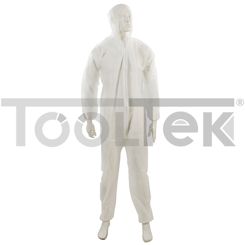 Tuta da lavoro usa e getta Tuta da lavoro in polipropilene bianco, con zip sul davanti e cappuccio, polsini e caviglie con elastico Leggera e traspiranteMisura: XL 136 cm Protegge da polvere e sporcoIdeale per lavori di fai da teConsigliamo di scegliere una tuta con una misura in più