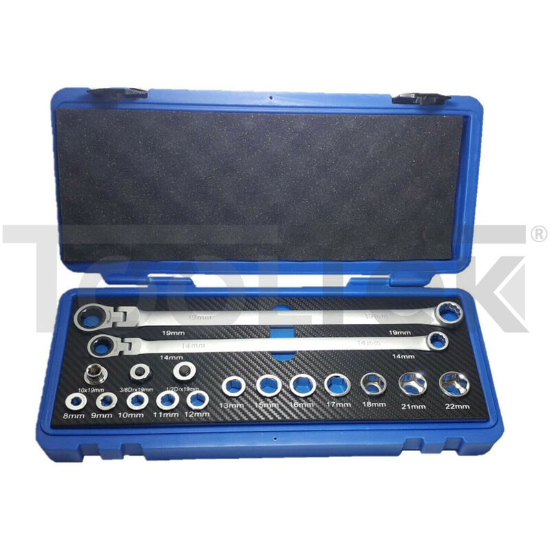 Set 17 pezzi chiavi lunghe a cricchetto con snodo adattatori bussole da 8 a 22mm Set composto da 2 chiavi lunghe a cricchetto con un'estremità a snodo e 15 adattatori di varie misure. Contenuto: Chiave a cricchetto 19mm Chiave a cricchetto 14mm 7 adattatori / bussole da 13, 15, 16, 17, 18, 21 e 22mm (attacco 19mm) 5 adattatori / bussole da 8, 9, 10, 11 e 12mm (attacco 14mm) Adattatore 3/8 x 19mm Adattatore 1/2 x 19mm Adattatore 10x19mm Prodotto di qualità