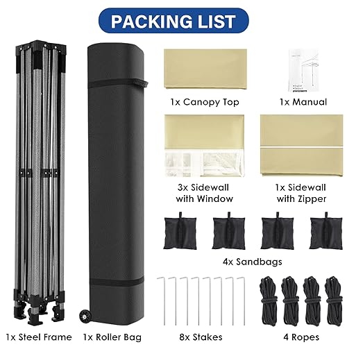 Tessuto di alta qualità e pannelli laterali rimovibili: la tenda è realizzata in tessuto 420D ad alta resistenza con due strati di rivestimento in PU, 100% impermeabile. Ha protezione UPF50+ per bloccare i dannosi raggi UV. Le cuciture sono completamente incollate per evitare che le gocce d'acqua entrino nelle cuciture. Tre pareti laterali con finestre, una porta con cerniera. Le chiusure in velcro sulle pareti laterali mantengono chiuso il chiosco pieghevole. Ogni parete laterale è rimovibile.