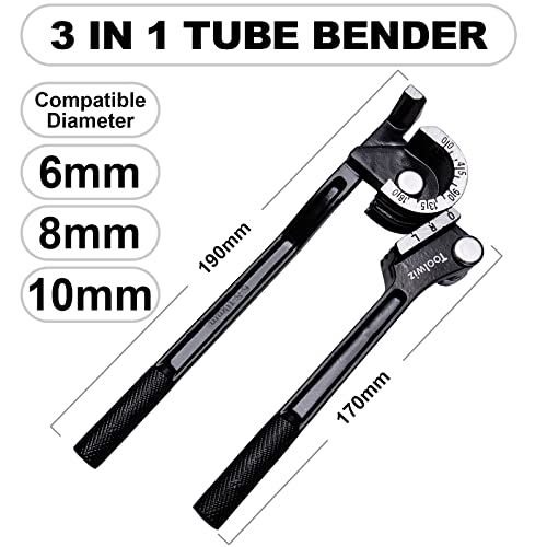 3 dimensioni in 1 design: Questa piega tubi può lavorare su 3 diverse dimensioni di curvatura dei tubi: 6 mm, 8 mm e 10 mm. Si prega di notare che l'attrezzo curvatubi Toolwiz è per la piegatura a due mani di tubi morbidi cavi a parete sottile fino a 180°, con uno spessore massimo della parete di 0,8 mm.