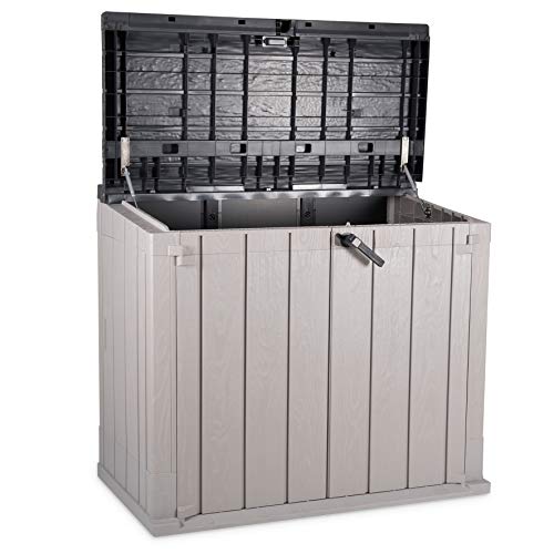 Baule portattrezzi da giardino di 842L di volume, decoro legno e dimensioni cm 129,5x74,5x111h