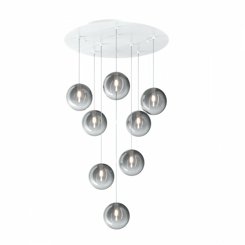 Plafoniera con base tonda a otto luci con altezza regolabile, particolare design definito dal vetro pirex soffiato. Offre un tocco di classe in ogni stanza della tua casa. Una luce diffusa per ogni esigenza. Plafoniera moderna Top Light ECLIPSE 1184BI S8 T FU G9 LED Lampada da soffitto tonda in metallo e vetro pirex soffiato, da interni Categoria Plafoniere. Una lampada da soffitto moderna con base tonda attaccata al soffitto e otto luci rifinite da sfere in vetro pirex soffiato. ECLIPSE 1184BI/S8 T-FU è composta da una struttura BIANCA (a richiesta cromo o ottone satinato), i vetri sono colore FUME' a richiesta ambra, bianco fog, oro, rame o trasparente. Per quanto riguarda le lampade con più luci la finitura dei vetri può essere scelta anche di colori misti come bianco e trasparente, trasparente e ambra, trasparente e fumè oppure multicolor, per soddisfare qualsiasi esigenza. La finitura dei vetri si presenta omogenea nelle versioni trasparente e bianco fog. oppure sfumata verso il