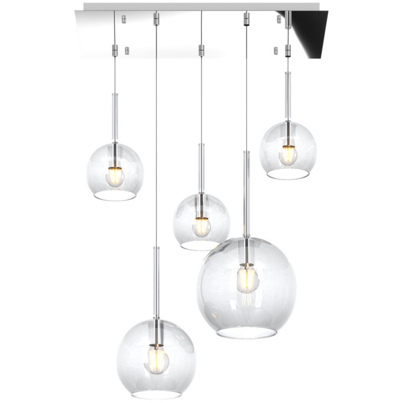 Collezione Future IL FUTURO DELLA LUCE È ADESSO Sospensione 5 luci dal rosone rettangolare con struttura in metallo finitura cromo e da 5 vetri tutti differenti nelle dimensioni colore trasparente.. Le finiture dei vetri cromo, rame, oro e ambra sono trattamenti superficiali che riducono solo parzialmente l'emissione luminosa. La finitura trasparente può essere naturalmente abbinata alle altre. Le strutture in metallo sono disponibili nelle finiture cromo, bianco e ottone satinato, con il diffusore in vetro disponibile in tutte le finiture esistenti.Possibilità di creare una composizione componibile in base ai componenti della sospensione scelti.Questo articolo è disponibile in diverse finiture e/o dimensioni. E' possibile indicarlo nell'apposito campo NOTE presente in conclusione di ordine oppure contattarci dopo aver effettuatol'ordine.
