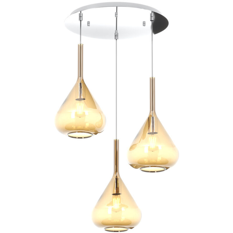 Collezione Kona LAMPADA MODERNA CHE CATTURA LO SGUARDO Sospensione 3 luci con struttura in metallo color cromo, un rosone tondo e 3 vetri pirex soffiato colore ambra come diffusore.. Le finiture dei vetri disponibili sono trasparente, verde, blu, fumè ed ambra. Le strutture in metallo sono disponibili nelle finiture cromo, bianco e ottone satinato. Nella confezione sarà compreso il portalampada nelle finiture cromo, otttone satinato e bianco, dove il cliente al momento dell' installazione sarà libero di scegliere il colore desiderato.Questo articolo è disponibile in diverse finiture e/o dimensioni. E' possibile indicarlo nell'apposito campo NOTE presente in conclusione di ordine oppure contattarci dopo aver effettuatol'ordine.