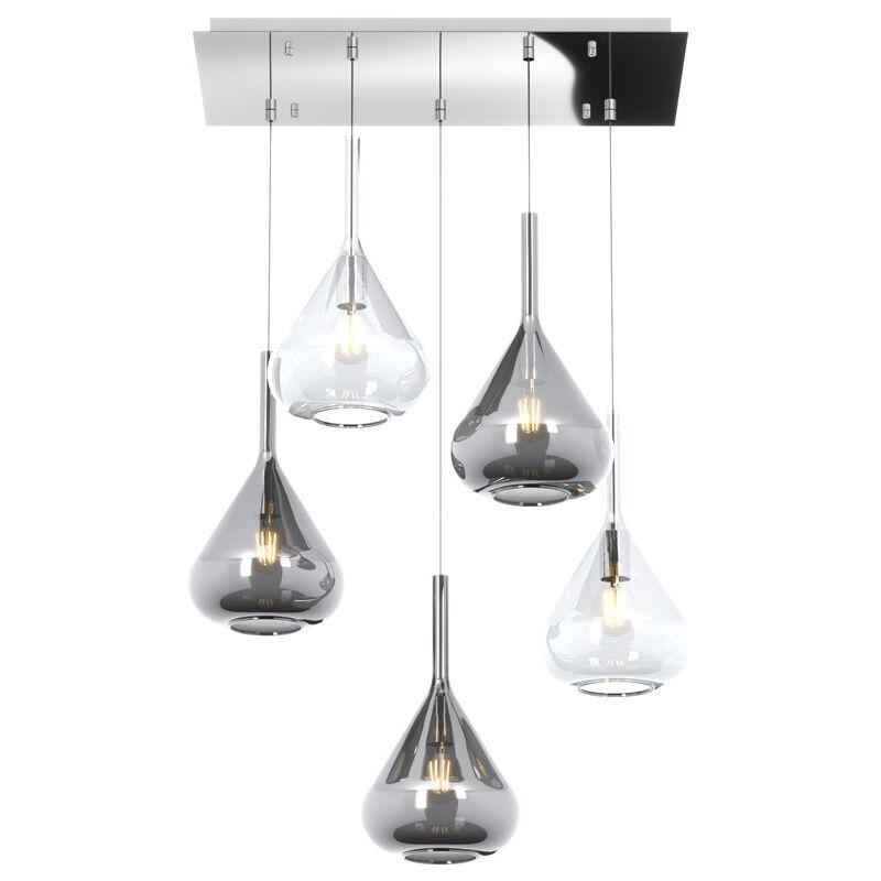 Collezione Kona LAMPADA MODERNA CHE CATTURA LO SGUARDO Sospensione 5 luci con struttura in metallo color cromo, un rosone rettangolare e 5 vetri pirex soffiato colore trasparente e fumè come diffusore.. Le finiture dei vetri disponibili sono trasparente, verde, blu, fumè ed ambra. Le strutture in metallo sono disponibili nelle finiture cromo, bianco e ottone satinato. Nella confezione sarà compreso il portalampada nelle finiture cromo, otttone satinato e bianco, dove il cliente al momento dell' installazione sarà libero di scegliere il colore desiderato.Questo articolo è disponibile in diverse finiture e/o dimensioni. E' possibile indicarlo nell'apposito campo NOTE presente in conclusione di ordine oppure contattarci dopo aver effettuatol'ordine.