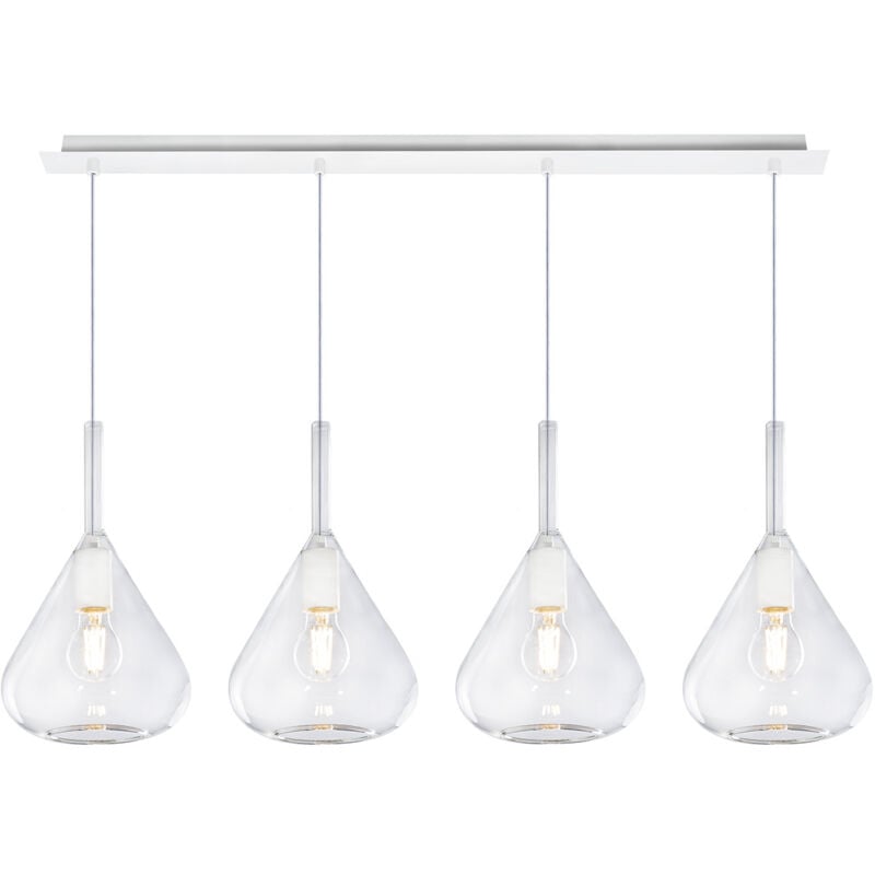 Collezione Kona LAMPADA MODERNA CHE CATTURA LO SGUARDO Sospensione 4 luci con struttura in metallo color bianco, un rosone rettangolare lineare e 4 vetri pirex soffiato di colore trasparente come diffusore.. Le finiture dei vetri disponibili sono trasparente, verde, blu, fumè ed ambra. Le strutture in metallo sono disponibili nelle finiture cromo, bianco e ottone satinato. Nella confezione sarà compreso il portalampada nelle finiture cromo, otttone satinato e bianco, dove il cliente al momento dell' installazione sarà libero di scegliere il colore desiderato.Questo articolo è disponibile in diverse finiture e/o dimensioni. E' possibile indicarlo nell'apposito campo NOTE presente in conclusione di ordine oppure contattarci dopo aver effettuatol'ordine.