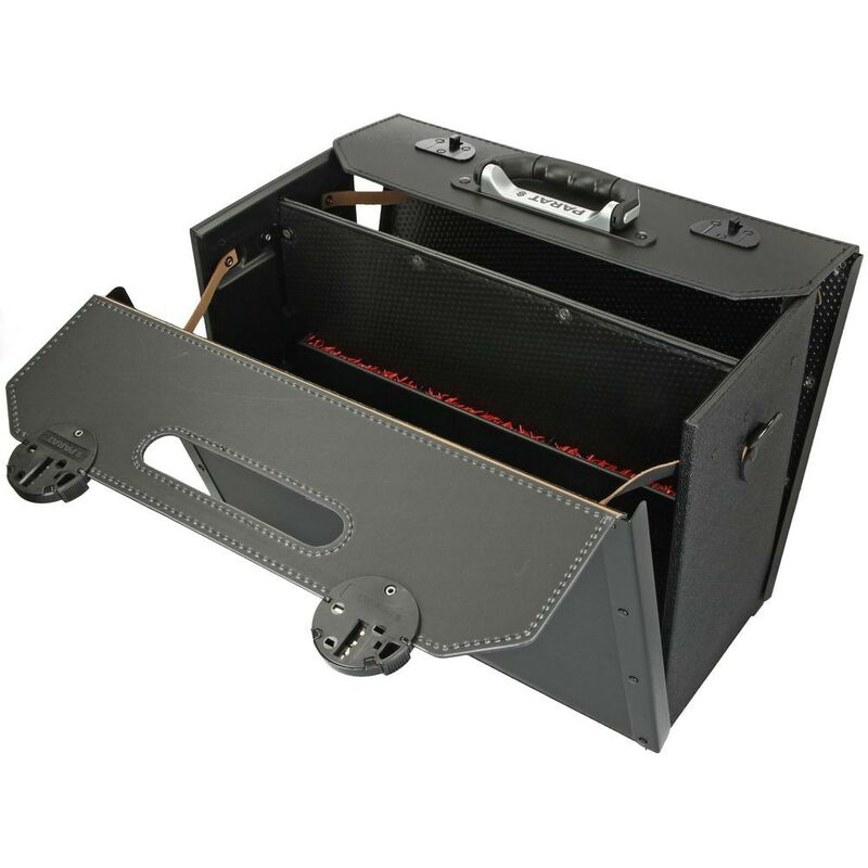 Questa borsa vuota con parete centrale e pareti anteriori e posteriori pieghevoli offre più ordine e chiarezza - quindi lo strumento è sempre al suo posto e rapidamente a portata di mano. La robusta pelle vachette è rinforzata con angoli in alluminio e il rivestimento interno Con-Pearl® rende l'interno particolarmente resistente. lo speciale effetto di serraggio di plastiche di alta qualità consente di ospitare fino a 70 utensili. la tracolla regolabile con tracolla offre un piacevole comfort di usura ed è attaccata agli anelli rivettati sui lati. Materiale: Pelle naturale Anche: 311779020 (sacco per utensili 16000-571) . 311779091 (nuovo classico 5360.000-031) borsa universale. 311778911 (paratt new classic tool sachoche 5471.000-031) Dimensioni: 510 x 400 x 230 mm Colore: Nero EAN: 4006793183315 Peso [kg]: 4.5
