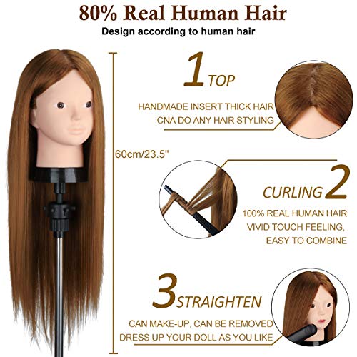 TopDirect 23.5" 80% veri capelli Trucco Testina Parrucchiere Testa Studio Parrucchiere Manichino Cosmetologia Formazione Parrucchiere Pratica Modello Capelli con Morsetto + Acconciature per Capelli