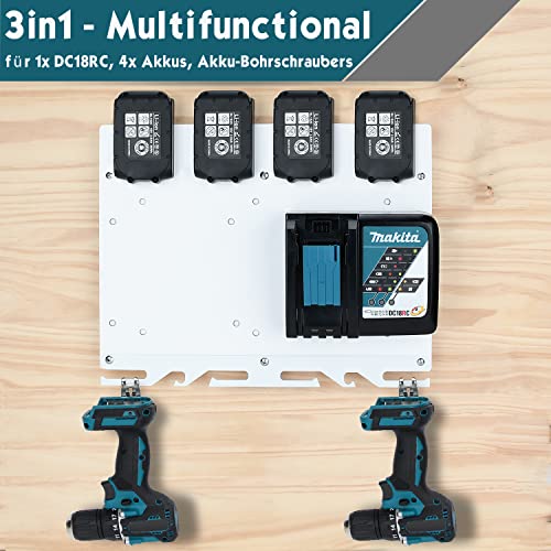 TOPOWN HPL - Supporto da parete 3 in 1 per porta batteria e caricabatterie, stabile, 4 pezzi, 18 V, 14,4 V, per Makita 2 x DC18RC e 1 x DC18RD, con gancio per avvitatore a batteria, in HPL