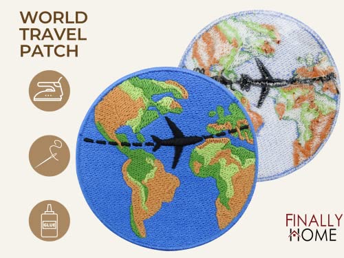 Toppa da viaggio per backpacker: un ottimo termoadesivo per tutti coloro che hanno intenzione di vedere il mondo! Una patch di viaggio che mostra il mondo e un aereo. Nella migliore qualità Finally Home