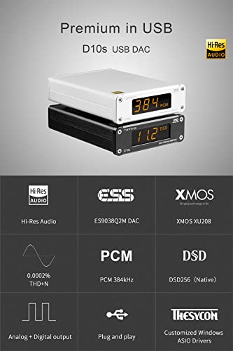 XMOS XU208 e driver personalizzato - D10s utilizzano XMOS XU208 per l'interfaccia USB e utilizzano driver personalizzati che da Thesycon per una migliore compatibilità con file audio ad alta risoluzione, in particolare DSD native.E utilizzare ESS ES9038Q2M per rendere THD+N a partire da 0,0002%@1kHz