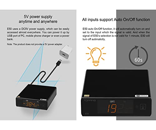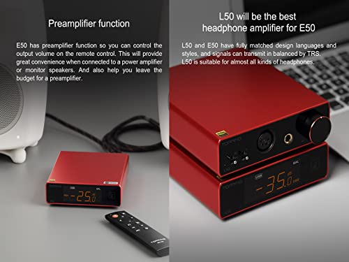 Alcuni aggiornamenti - Sull'E50, l'ingresso ottico e coassiale tradizionale non solo supporta PCM 24bit192kHz, ma supporta anche il rendering Dop DSD64 e MQA. E utilizzando CPLD per elaborare l'orologio e ottimizzare notevolmente il segnale digitale, raggiunto incredibile soppressione del jitter capa-bilità. L'uso della nuova tecnologia rende il femtosec-ond crystal e l'orologio esterno non più necessari per sopprimere il jitter. E puoi scegliere "solo TRS", RCA solo" o TRS+RCA" uscita per soddisfare diversi usi nei sistemi