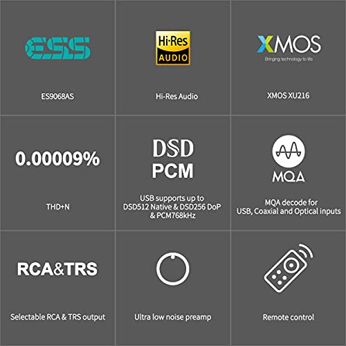 "L'udito è sapere" - E50 utilizza il più recente chip DAC ES9068AS ad alte prestazioni. Con la nostra eccellenza nel design e ingegneria, fornisce una qualità del suono realistica e trasparente. E USB supporta DSD512 e PCM768kHz. L'ingresso USB ha le migliori prestazioni di E50. Utilizza il secondo processore XMOS XU216 a 16 core, che supporta PCM a 32 bit768 kHz, audio nativo ad alta resa DSD512 e decodifica completa MQA. Ha un suono di qualità audiofila, per una migliore festa dell'udito