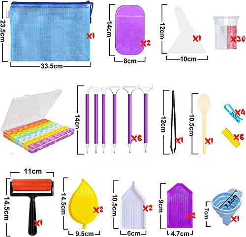 Forniture per pittura diamantata: include 1 scatola da 56 griglie, 20 sacchetti con chiusura lampo, 20 pezzi di argilla per colla, 6 manici in spugna, 1 strumento per pittura diamantata, 6 stick di colla, 1 penna per trapano, 2 cuscinetti antiscivolo, 6 piccoli vassoi diamantati, 1 imbuto, 2 clip, 1 cucchiaio, 1 adesivo per etichette, 1 rullo per pittura a diamante, 1 pinzetta, 1 custodia con cerniera.