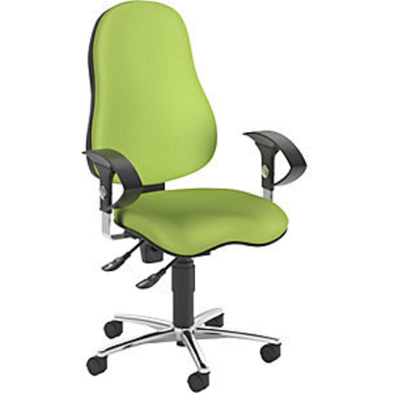 Sedia girevole da ufficio SITNESS 10, con braccioli regolabili, verde mela. Fornitura = smontato. Rivestimento = polipropilene. Colore rivestimento = verde mela. Colore telaio = cromato. Materiale telaio = acciaio, cromato. Meccanismo sedile = meccanismo di contatto permanente. Versione telaio = con rotelle. Campo di regolazione altezza = 420 - 550 mm. Versione dei braccioli = con braccioli. Altezza schienale = 570 mm. Dotazione = sostegno delle vertebre lombari. Profondità sedile = 450 mm. Larghezza sedile = 480 mm. Forma scocca = sedile ortopedico. Norma = DIN EN 1335 parte 1 - 3, DIN EN 12527 + DIN EN 12529. Versione rotelle = rotelle per superfici morbide. Portata = 110 kg. Durata/giorno = fino a 6 ore. Tipo di prodotto = sedie girevoli per ufficio. Schienale dalla forma sagomata con sostegno per le vertebre lombari integrato. Sedile ortopedico fitness brevettato con snodo Body-Balance Tec®. Braccioli di serie regolabili in altezza. Meccanismo di contatto permanente, bloccabile e