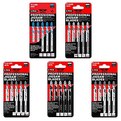 TopsTools - Confezione da 25 pezzi di utensili JSTTK5B T101B T101BR T111C T118A T144D, lame miste adatte per seghetti alternativi Bosch, DeWalt, Makita, Milwaukee e molti altri