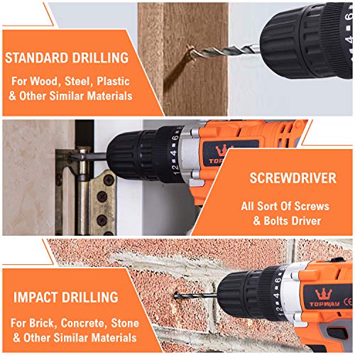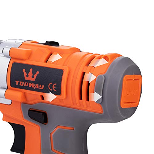 TOPWAY Trapano Avvitatore a Percussione a Batteria 12V con 10mm Mandrino Senza Chiave, 2 x 1.5Ah Batterie, 2 Velocità e Luce LED, per Forare il Legno, Muro di Mattoni, Cemento, Metallo 102001E