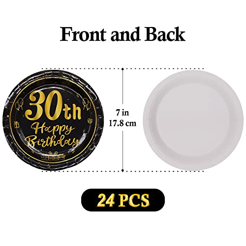 TOPWAYS 30 Anni Compleanno Piatti Carta, 24 Pezzi Oro Nero Ø18cm carta servizio piatti monouso per feste di decorazioni compleanno 30 Anni Uomo Donna (7pollici, 30 Happy Birthday)