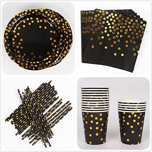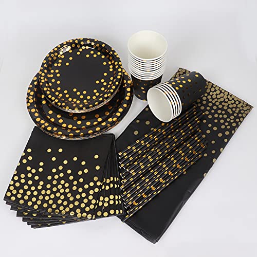Bel design: tovaglia: colore nero con motivo a coriandoli a pois dorati, forniture per la tavola di carta: progettato in stile nero con pois oro puntino, elegante e piacevole da abbinare bene alla tua decorazione e per stupire i tuoi ospiti, rendendo la tua festa memorabile e impressionante