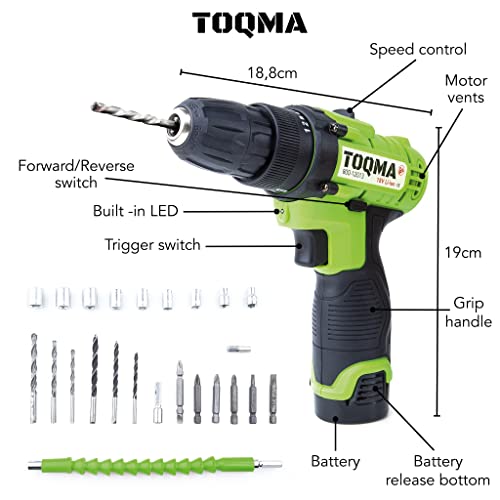 TOQMA Trapano Avvitatore Batteria Professionale 12V 32Nm Con 24 Punte, Avvitatore Elettrico Con 2 Batterie 1500 mAh, Velocità Regolabile Fino A 1450 Giri/Min, Frizione 18+1, Luce Led, 10mm Automatico