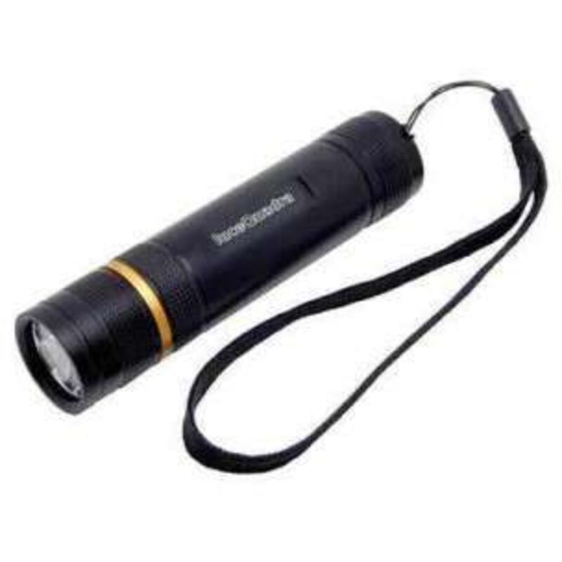 Torcia in alluminio a batteria. Torcia con batterie Duracell incluse Grado di protezione: IPX4 - Protetto contro gli spruzzi d'acqua Alimentazione: 3 batterie AAA (incluse) Illuminazione: 1 LED CREE XP-E R3 - 3 Watt Luminosità: 150 lumen Portata della luce: 100 metri Autonomia: 3 ore Funzioni: ON/OFF Pacco batterie estraibile Materiale: alluminio Dimensioni: 113 x 27 (diametro) mm EAN 8016818099374