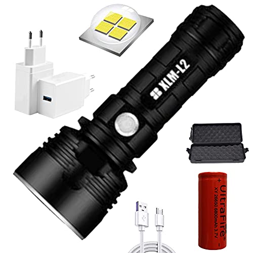 【SUPER LUMINOSO】--Questa è la torcia più potente e luminosa al mondo. Con una struttura solida e una luminosità accecante, la torcia ricaricabile è dotata di uno stoppino LED da 4 pezzi ad alto lumen, l'uscita massima è fino a 100.000 lumen e la distanza massima del raggio è fino a 2350 metri (quasi 8429 piedi).