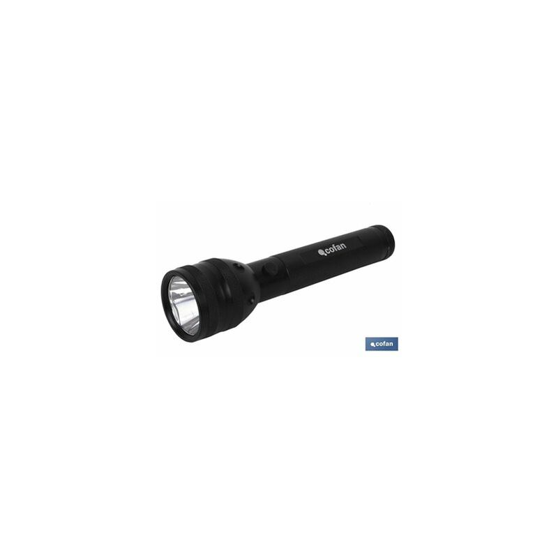 Torcia LED in alluminio da 3 W, 140 lumen, con misure di 5 x 23 cm, 3 funzioni, distanza 100 metri, grado IPX3, Caratteristiche tecniche: Batteria: 2 X LR14 Distanza: 100 m Funzioni: 100% - 50% - lampeggiante