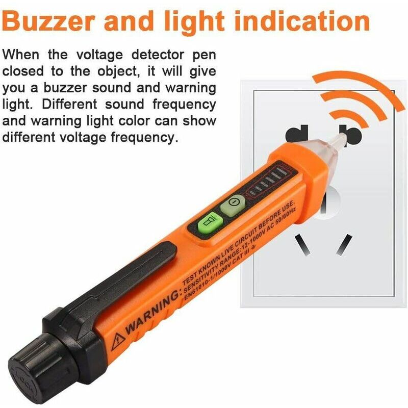 Penna per tester di tensione senza contatto sicura: questa penna per tester di tensione senza contatto è affidabile e rapida per determinare se l'oggetto ha tensione CA inducendo il campo elettromagnetico generato dalla tensione CA ★ Rilevamento della tensione CA e filo nullo/attivo Giudizio: rileva con precisione la tensione CA che va da 12 V a 1000 V, nel frattempo, può distinguere tra filo vivo e zero attraverso il suono di allarme di frequenza diversa e l'indicatore LED < br/>★ Torcia e funzione di spegnimento automatico: ambiente buio e può anche essere un luce di emergenza. Supporta lo spegnimento automatico dopo 5 minuti di inattività per risparmiare energia ★ Segnale acustico e luminoso: quando la penna del rilevatore di tensione si chiude sull'oggetto, emette un segnale acustico e una spia luminosa. Diverse frequenze sonore e colori LED possono visualizzare diverse frequenze di tensione Compatto e portatile: mini dimensioni con clip, leggero, questo tester di tensione