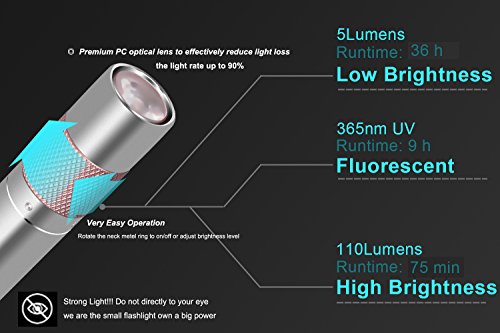 Torce a led doppio: torcia elettrica portachiavi / torcia Ultravioletti con basso potere 30nw (non necessita di occhiali protettivi). La torce UV 365nm è più sicura della torcia ultravioletta di 395nm per rilevare l'urina, i minerali, le macchie, lo scorpione e il denaro
