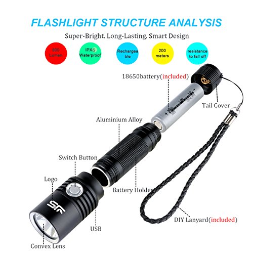 Torcia LED, Potente Cree 800 Lumens USB Ricaricabile Torcia Tattica,18650 Batteria con Supporto della Torcia della bici (Inclusa), Impermeabile IPX6 Ideale per Campeggio, Ciclismo, Attività all'Aperta