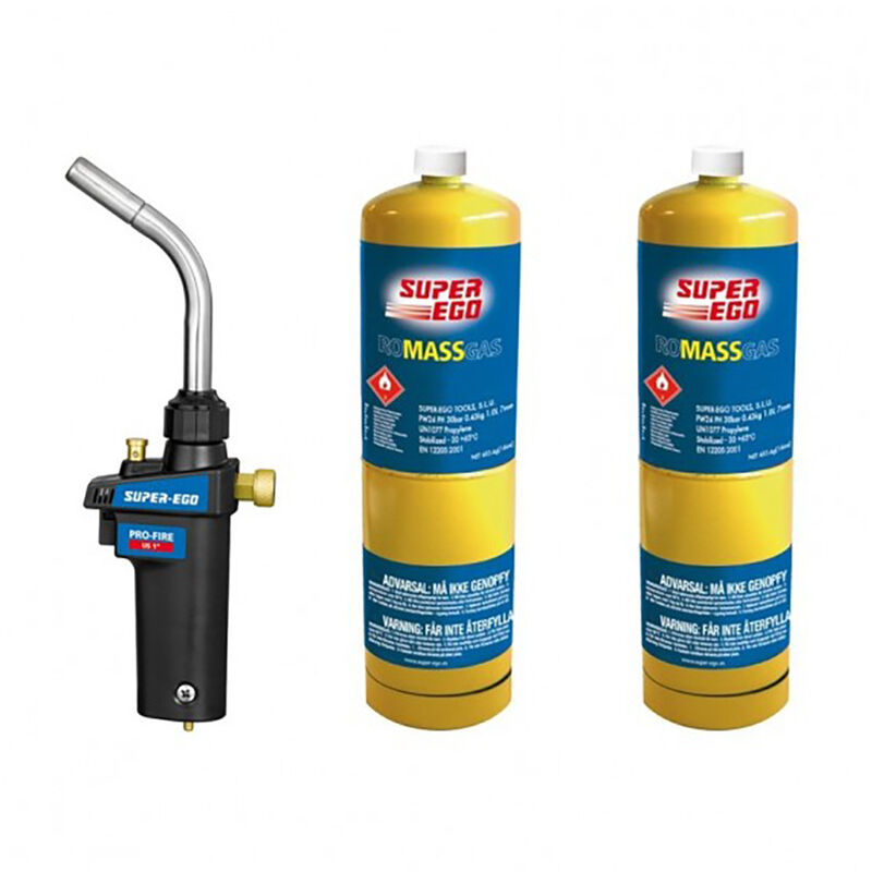 Kit torcia pro-fire + 2 bombole mapp gas 1 1500002772 super ego. torcia piezo professionale per brasatura con fiamma avvolgente. regolazione precisa de fiamma. design speciale per una migliore presa. adatto per l'uso con gas mapp super ego. accensione piezoelettrica. bruciatore in acciaio inox de 10mm ø. regolatore de fiamma. pulsante de blocco de fiamma. funziona in posizione invertita. 2 bombole de gas super ego incluse.