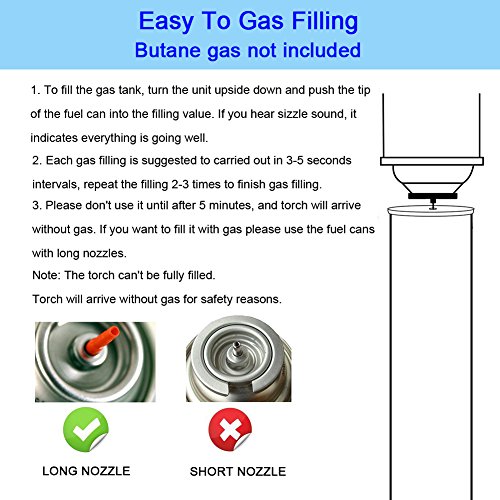 【Facile da usare】:Riempi la torcia con il butano, solo premere il pulsante, quindi blocca la fiamma in cucina.Secondo la vostra richiesta, scegli la fiamma che desideri. Il gas butano può essere riempito(ma, butano non incluso).Basato sulla torcia della cucina, c'è un foro di gonfiaggio per riempire il gas.