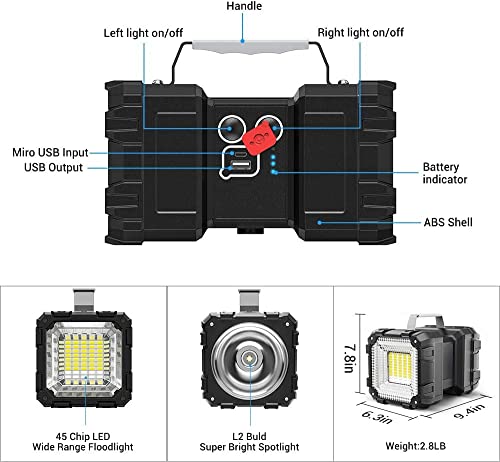 Orario di lavoro 10-20 ore. Raggio di illuminazione ultra lungo fino a 800 metri (circa 2.600 piedi). Un potente proiettore da campeggio e spia luminosa.