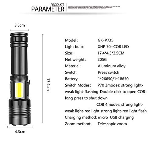 Torcia Tattica Ricaricabile, Torcia A LED XHP70 Con Luce Laterale COB Torcia Tattica Ricaricabile Ad Alta Luminosità 7 Modalità Di Luce Torcia Portatile Con Batteria 26650 Per Esterno, Campeggio