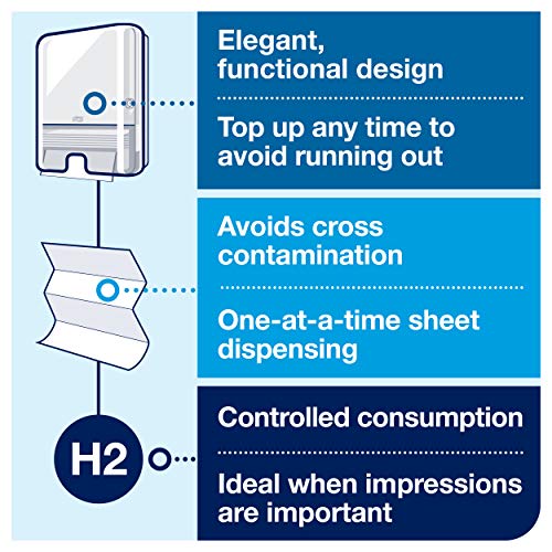 Articolo consegnato: 1 dispenser bianco Tork per asciugamani intercalati compatibile con sistema H2, 44.4 cm (altezza) x 30.2 cm (larghezza) x 10.2 cm (profondità)
