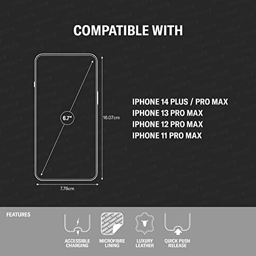 COMPATIBILITÀ - Custodia in pelle TORRO progettata e realizzata per iPhone Pro Max / Plus con una diagonale dello schermo da 6,7 pollici. Gli iPhone compatibili includono iPhone 14 Pro Max, iPhone 14 Plus. iPhone 13 Pro Max e iPhone 12 Pro Max, saranno compatibili anche altri dispositivi delle stesse dimensioni o leggermente più piccoli. Progettato per telefoni con dimensioni 161 mm x 78 mm x 8 mm.