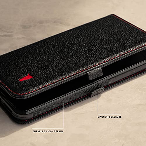 La custodia TORRO è realizzata a mano con vera pelle napa nera con cuciture rosse . Le custodie TORRO sono Qi compatibile e supportono la ricarica wireless con il telefono ancora nella custodia.