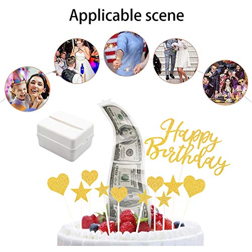 ▶ ▷ Confezione di valore: la confezione contiene 1 salvadanaio per torta di compleanno, 20 sacchetti trasparenti, 1 decorazioni per torte di buon compleanno in oro, 10 decorazioni per torte con glitter (a forma di cuore e stella), quantità sufficiente per soddisfare le tue esigenze di decorazione per torte.