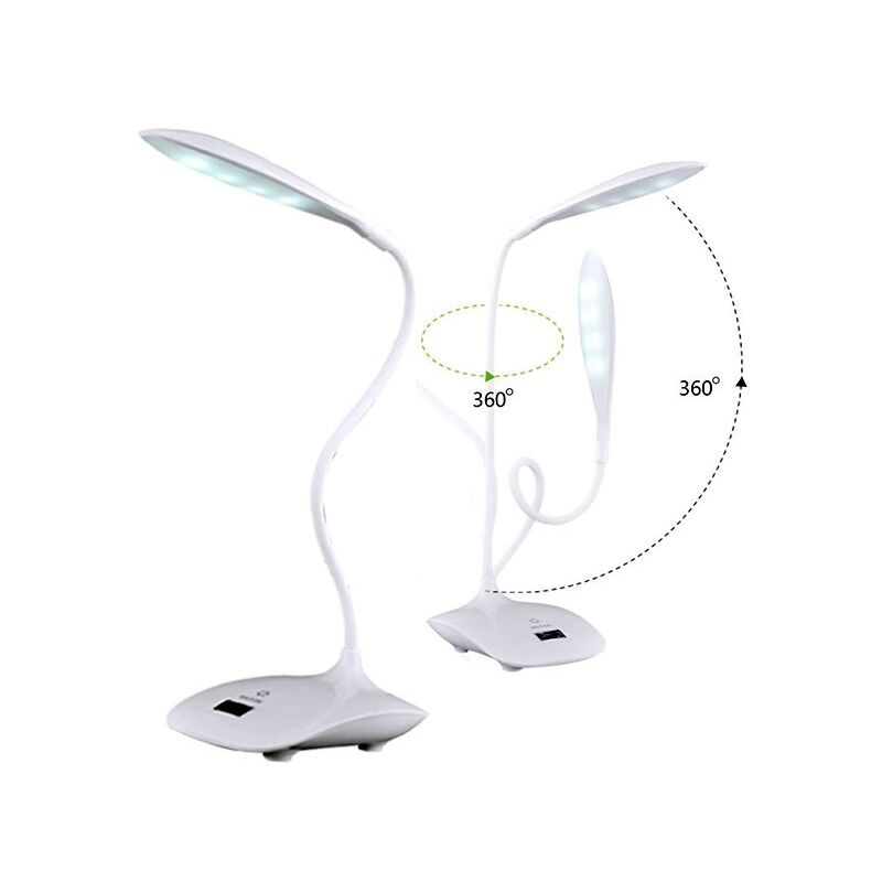 Fantastica lampada da tavolo/scrivania a batteria con ricarica tramite USB.libertàGrazie al tasto touch vi baster far scivolare le dita sul tasto per accendere la lampada e per passare da luce calda e luce fredda.libertàLa base della lampada ha un piccolo schermo lcd che riporta l'orario o la data.libertàUna ricarica completa dura circa 4/6 ore per una equivalente durata in accensione senza alimentazione.libertàStelo flessibile regolabile su tantissime posizioni personalizzate.libertàRipiegata occupa pochissimo spazio, leggerissima...ideale anche come lampada da campeggio o per mercatini serali.